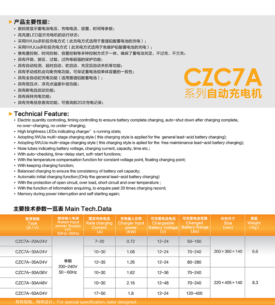 CZC7-300W系列自動充(chong)(chong)(chong)電(dian)(dian)(dian)(dian)(dian)機(ji)是一種造型新(xin)穎、功能強大、技(ji)(ji)術先(xian)進(jin)(jin)的高新(xin)技(ji)(ji)術產品。具有體積小、重量輕、操作(zuo)簡便、充(chong)(chong)(chong)電(dian)(dian)(dian)(dian)(dian)效率高、可靠性強等特(te)點(dian)。它(ta)將高頻電(dian)(dian)(dian)(dian)(dian)子技(ji)(ji)術和(he)微機(ji)控制技(ji)(ji)術相(xiang)結合,控制充(chong)(chong)(chong)電(dian)(dian)(dian)(dian)(dian)機(ji)按(an)設置的充(chong)(chong)(chong)電(dian)(dian)(dian)(dian)(dian)曲線充(chong)(chong)(chong)電(dian)(dian)(dian)(dian)(dian)。使(shi)蓄(xu)電(dian)(dian)(dian)(dian)(dian)池得到較好的充(chong)(chong)(chong)電(dian)(dian)(dian)(dian)(dian)效果,延長(chang)蓄(xu)電(dian)(dian)(dian)(dian)(dian)池組的循環(huan)壽命。整個充(chong)(chong)(chong)電(dian)(dian)(dian)(dian)(dian)過(guo)程(cheng)按(an)程(cheng)序自動進(jin)(jin)行,無(wu)需(xu)人員(yuan)值守。
