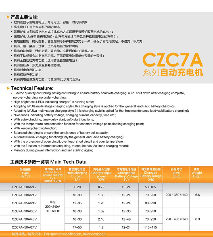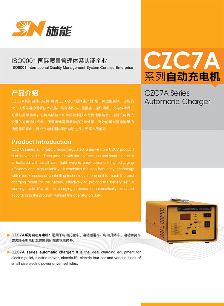 CZC7A系列自(zi)動(dong)充(chong)(chong)(chong)電(dian)(dian)(dian)機(可(ke)(ke)調式,CZC7的(de)(de)派生產品)是(shi)一(yi)種(zhong)造(zao)型(xing)新(xin)穎(ying)、功能強(qiang)大(da)、技(ji)(ji)術(shu)先(xian)進的(de)(de)高(gao)新(xin)技(ji)(ji)術(shu)產品。具有(you)體積(ji)小,重量輕、操作(zuo)簡便、充(chong)(chong)(chong)電(dian)(dian)(dian)效率高(gao)、可(ke)(ke)靠性高(gao)等特(te)點(dian):它將(jiang)高(gao)頻技(ji)(ji)術(shu)和微(wei)機控(kong)制技(ji)(ji)術(shu)有(you)機地相(xiang)結合,控(kong)制充(chong)(chong)(chong)電(dian)(dian)(dian)機按設置的(de)(de)充(chong)(chong)(chong)電(dian)(dian)(dian)曲線充(chong)(chong)(chong)電(dian)(dian)(dian),使蓄電(dian)(dian)(dian)池得到(dao)最佳的(de)(de)充(chong)(chong)(chong)電(dian)(dian)(dian)效果,有(you)效的(de)(de)延長(chang)蓄電(dian)(dian)(dian)池組的(de)(de)使用循(xun)環壽命,整個(ge)充(chong)(chong)(chong)電(dian)(dian)(dian)過程按程序自(zi)動(dong)進行,無(wu)需人員值守。