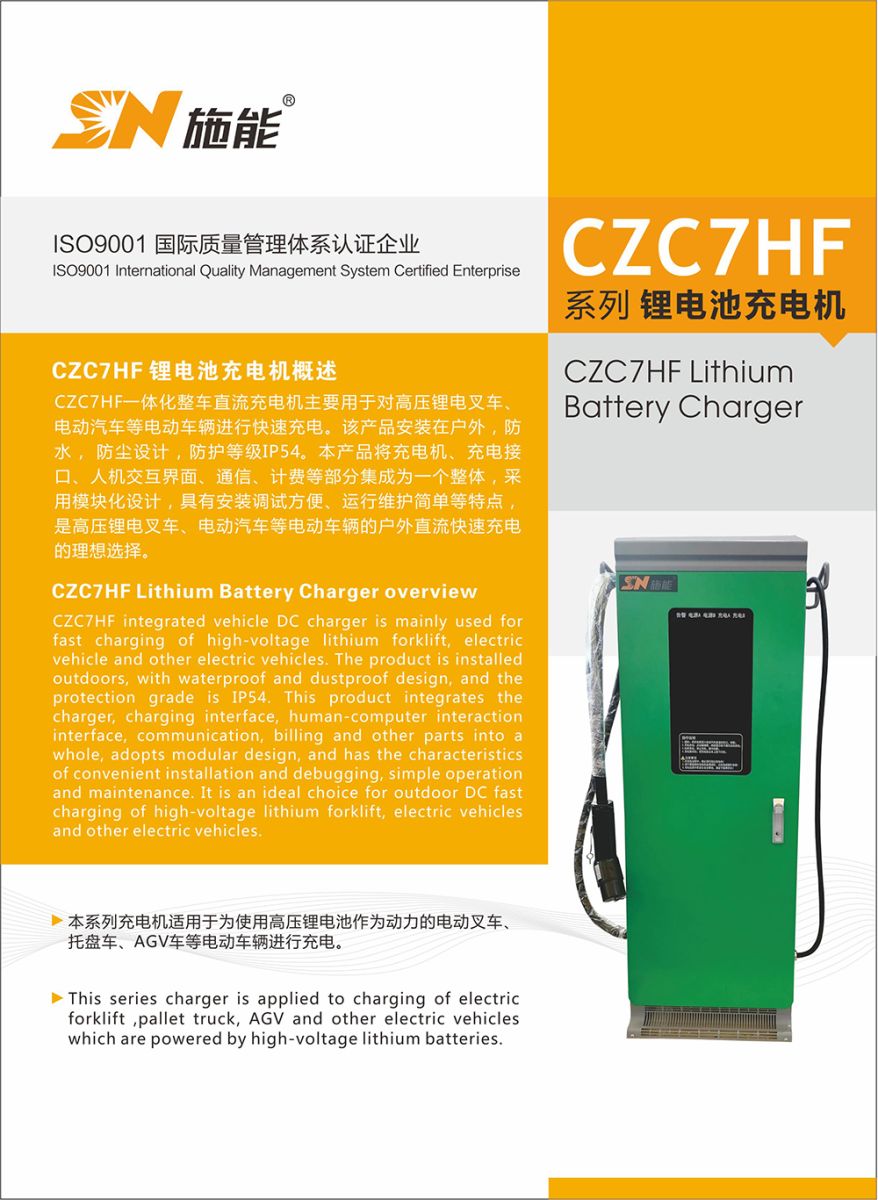 CZC7HF一(yi)體化(hua)整車直流充(chong)(chong)(chong)(chong)電(dian)(dian)(dian)機(ji)(ji)主要用于對高(gao)壓鋰電(dian)(dian)(dian)叉(cha)車、 電(dian)(dian)(dian)動(dong)汽車等電(dian)(dian)(dian)動(dong)車輛(liang)進(jin)行快(kuai)速充(chong)(chong)(chong)(chong)電(dian)(dian)(dian)。該產(chan)品(pin)安裝在(zai)戶(hu)外,防水,防塵設(she)計(ji)(ji),防護等級IP54。本產(chan)品(pin)將充(chong)(chong)(chong)(chong)電(dian)(dian)(dian)機(ji)(ji)、充(chong)(chong)(chong)(chong)電(dian)(dian)(dian)接口、人(ren)機(ji)(ji)交互界面、通(tong)信、計(ji)(ji)費等部分集成為一(yi)個整體,采用模塊化(hua)設(she)計(ji)(ji),具有安裝調試方便、運行維(wei)護簡單等特點(dian), 是高(gao)壓鋰電(dian)(dian)(dian)叉(cha)車、電(dian)(dian)(dian)動(dong)汽車等電(dian)(dian)(dian)動(dong)車輛(liang)的戶(hu)外直流快(kuai)速充(chong)(chong)(chong)(chong)電(dian)(dian)(dian) 的理想選擇。